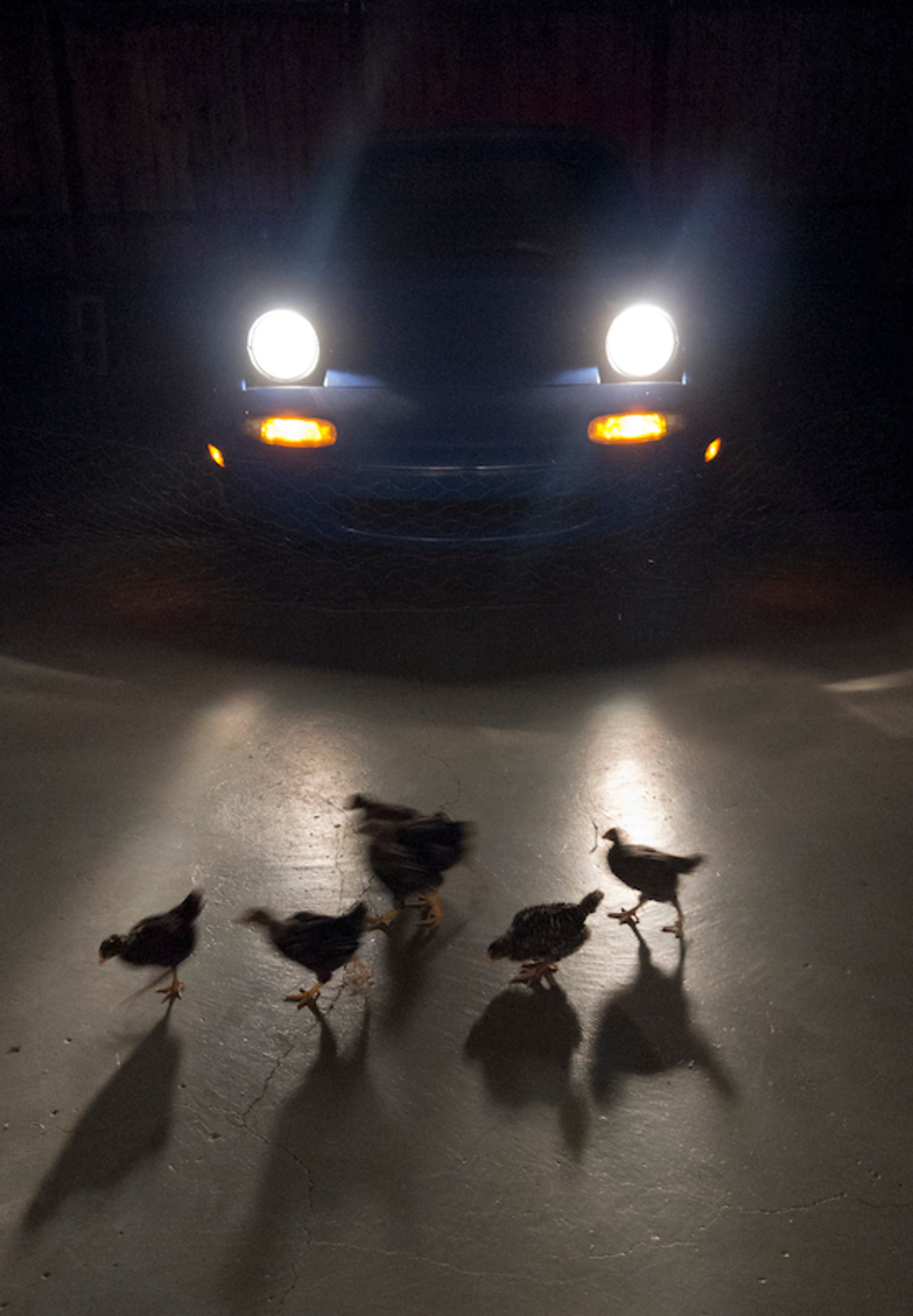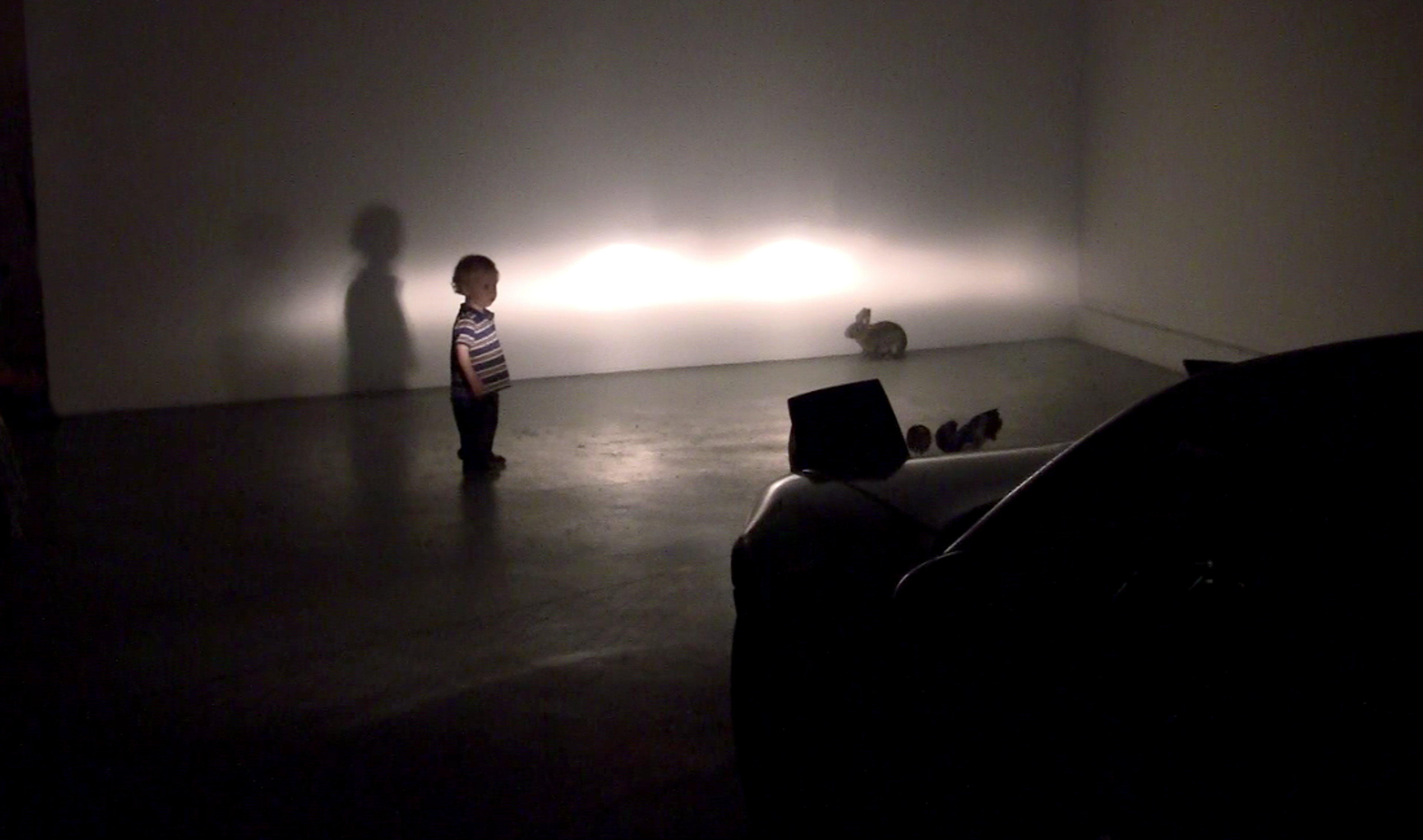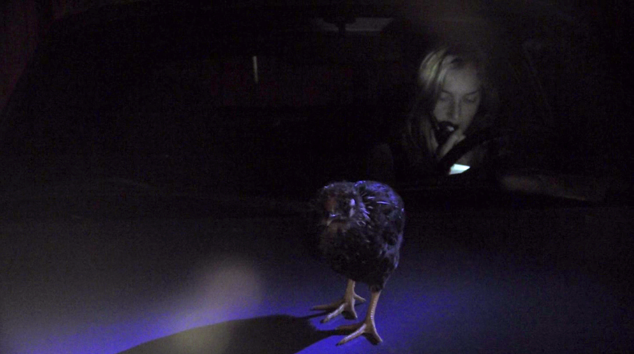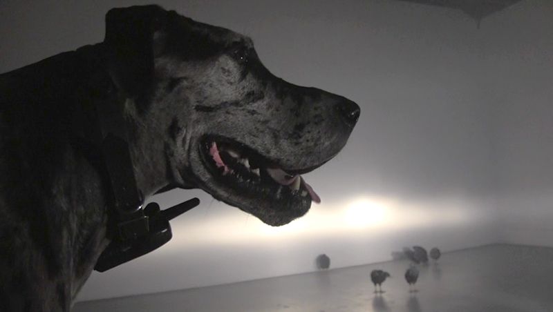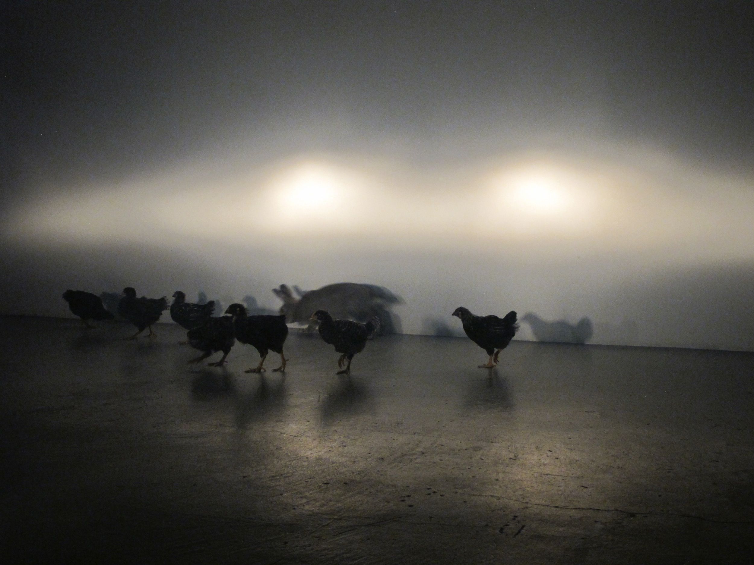fly room is based on Bennett Miller’s documentary THE CRUISE (1988) which profiles Timothy Levitch’s experience as a tantric tour bus operator guiding an audience through the gridlocked streets of New York City. The performance is an adaptation of the script casting Levitch as a mottled Great Dane as he tours an audience of seven teenage chickens and an apprehensive rabbit. His voice is disembodied and his prose are spoken with a female West-Coast accent.