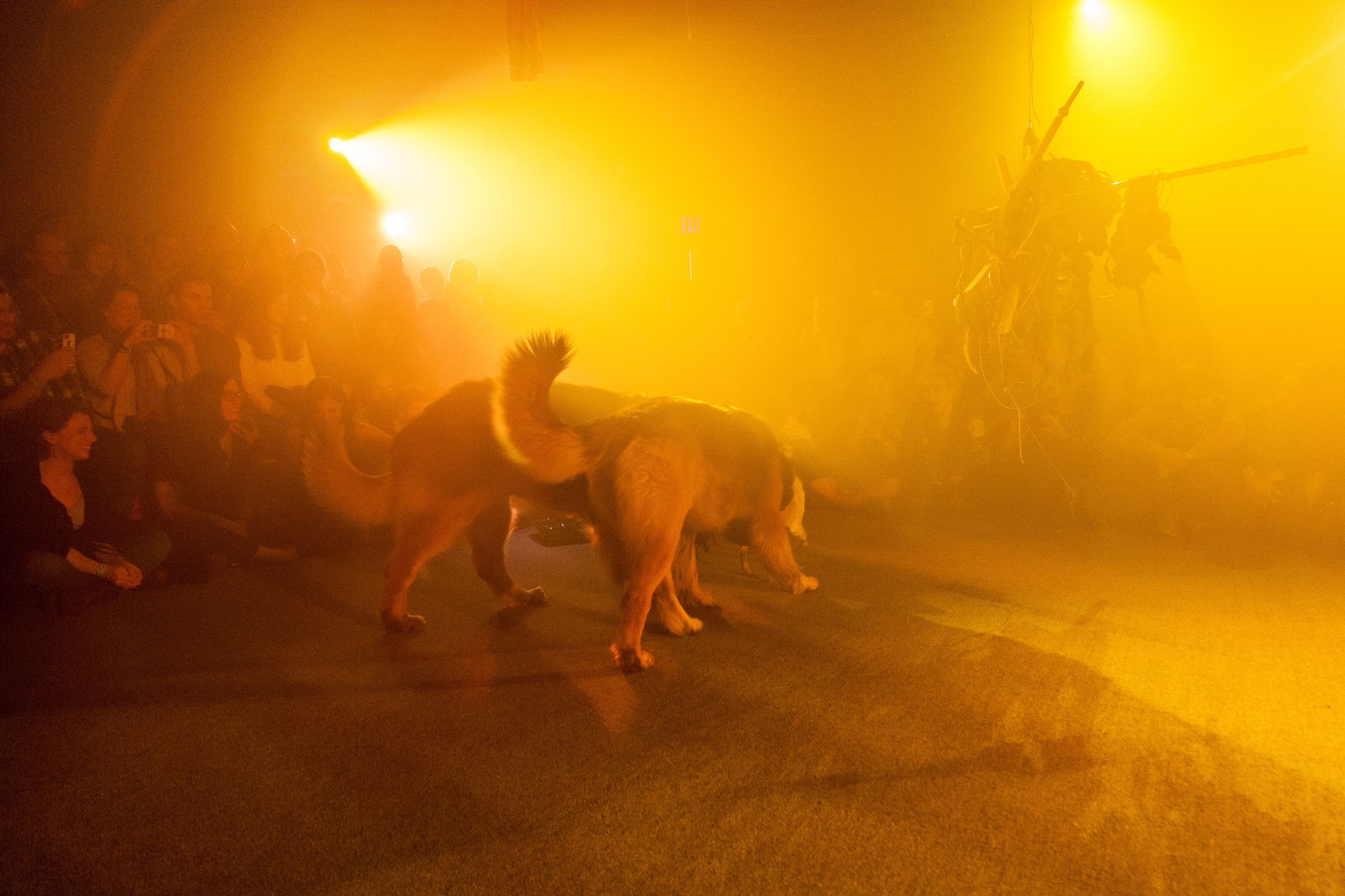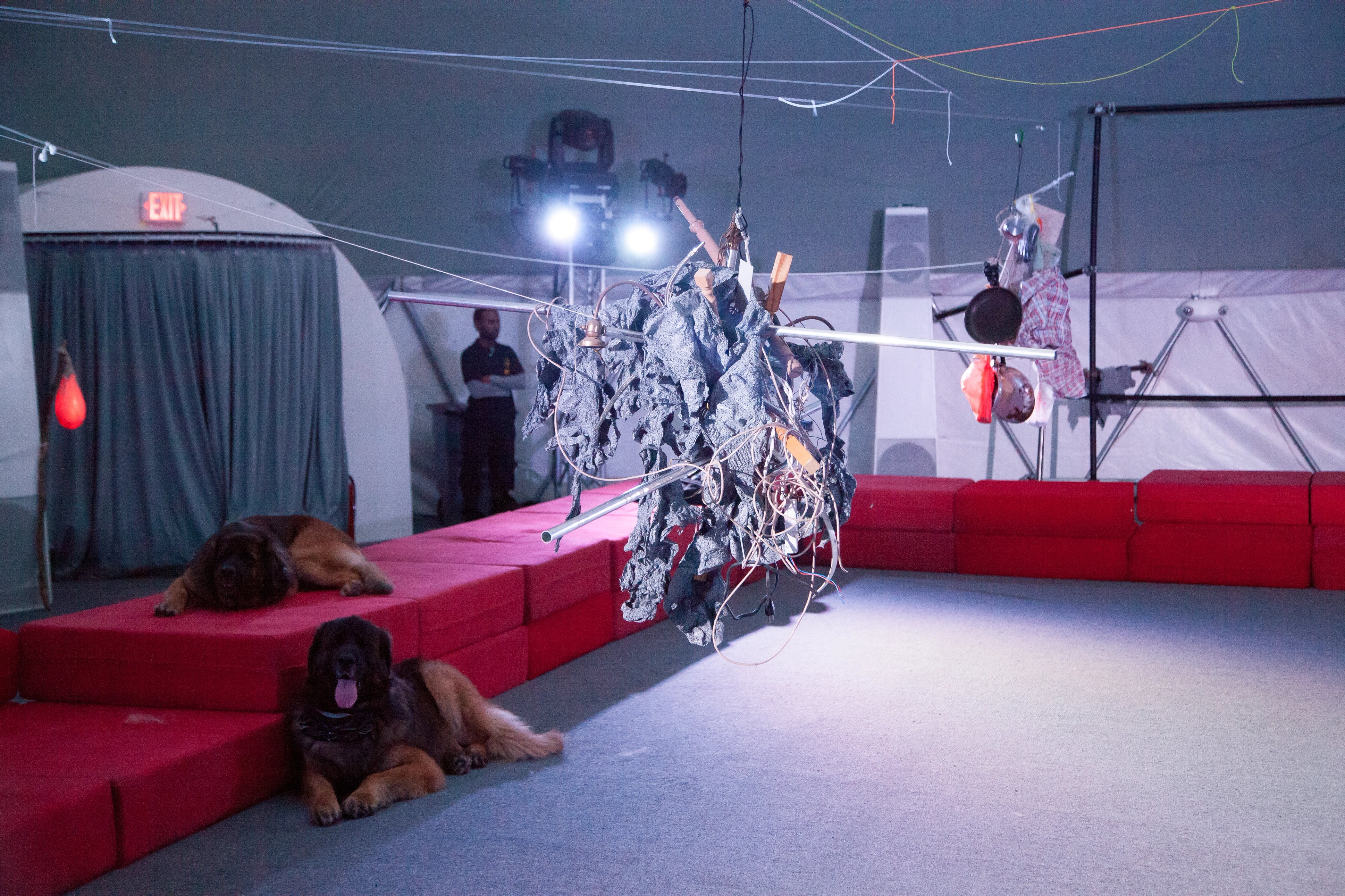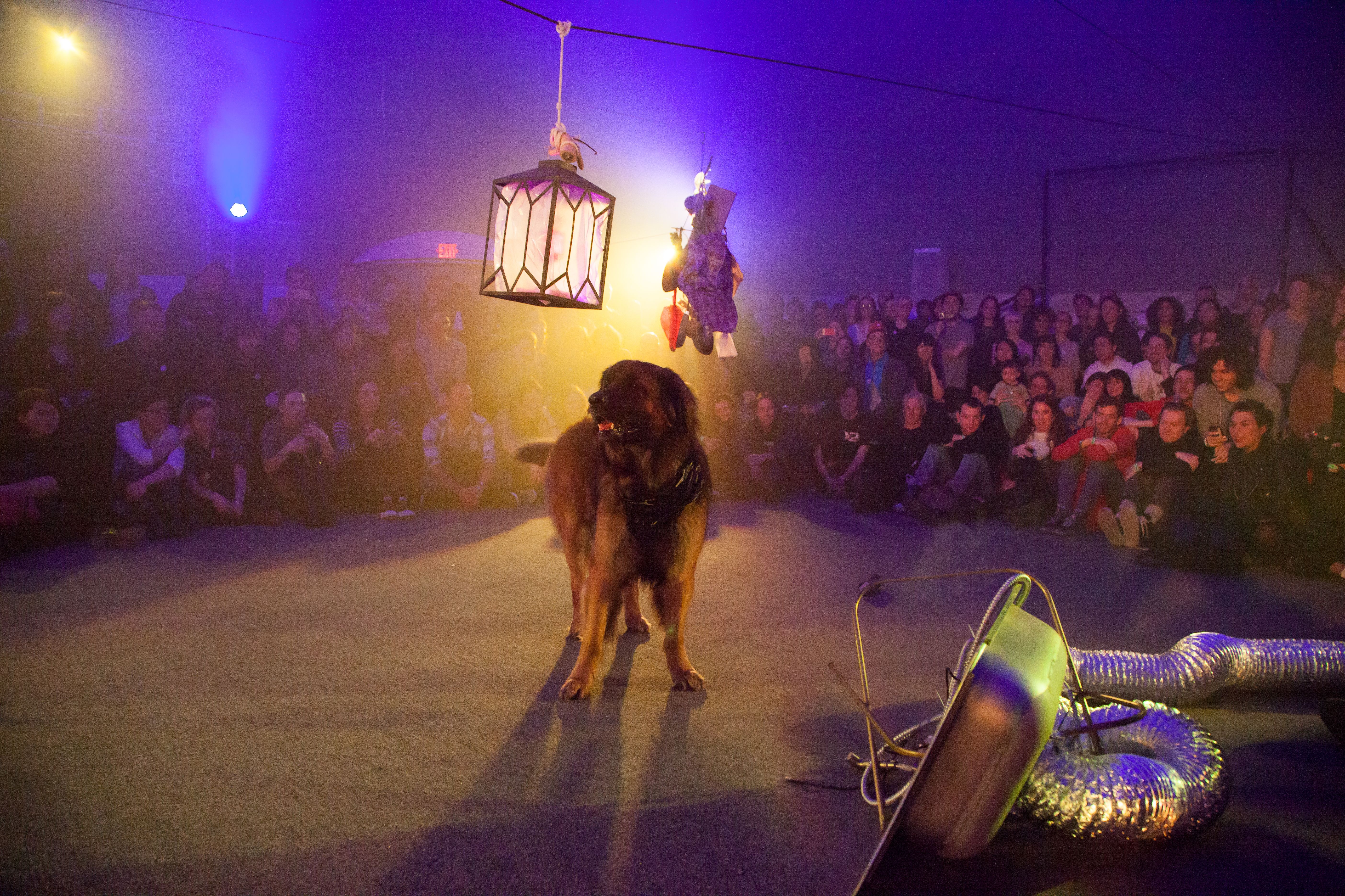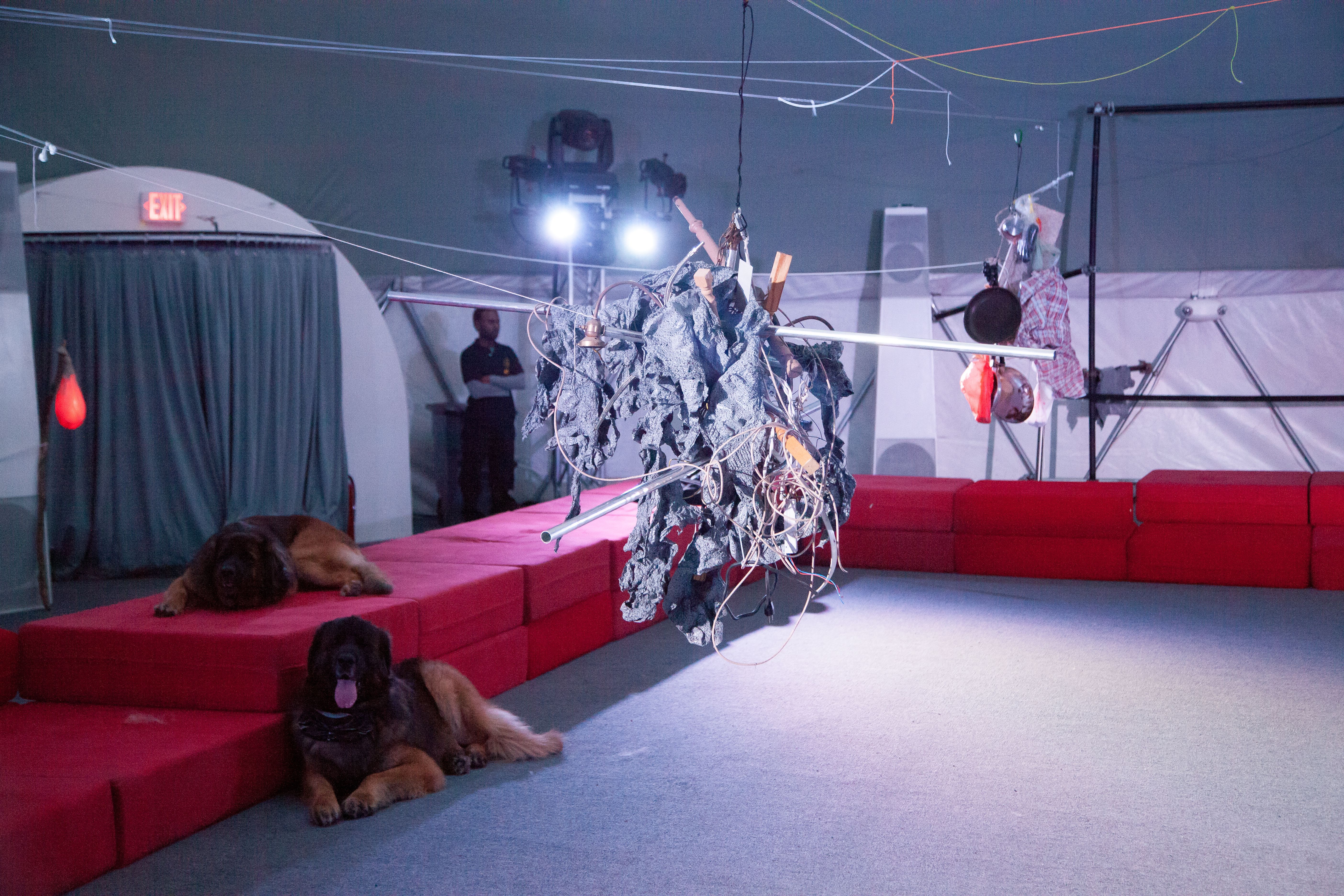 This performance combines elements from the disaster film Twister, 1996, with Charles Dickens’ Oliver Twist, interspersed with songs from the musical, Oliver!. Each dog carries a speaker that projects the internal monologue of its character, prerecorded by human actors, including Vaginal Davis. The play takes place against an apocalyptic backdrop, made in collaboration with Matthew Schrader.