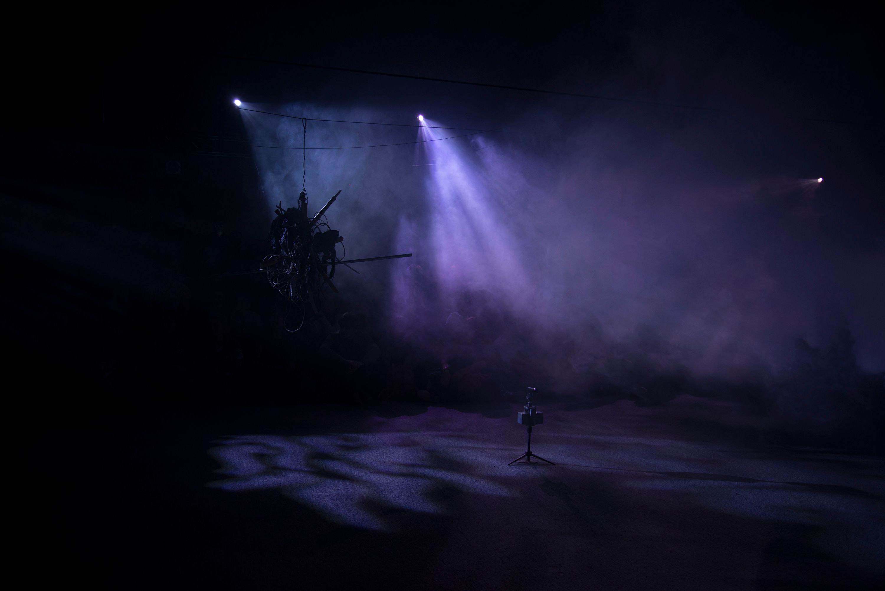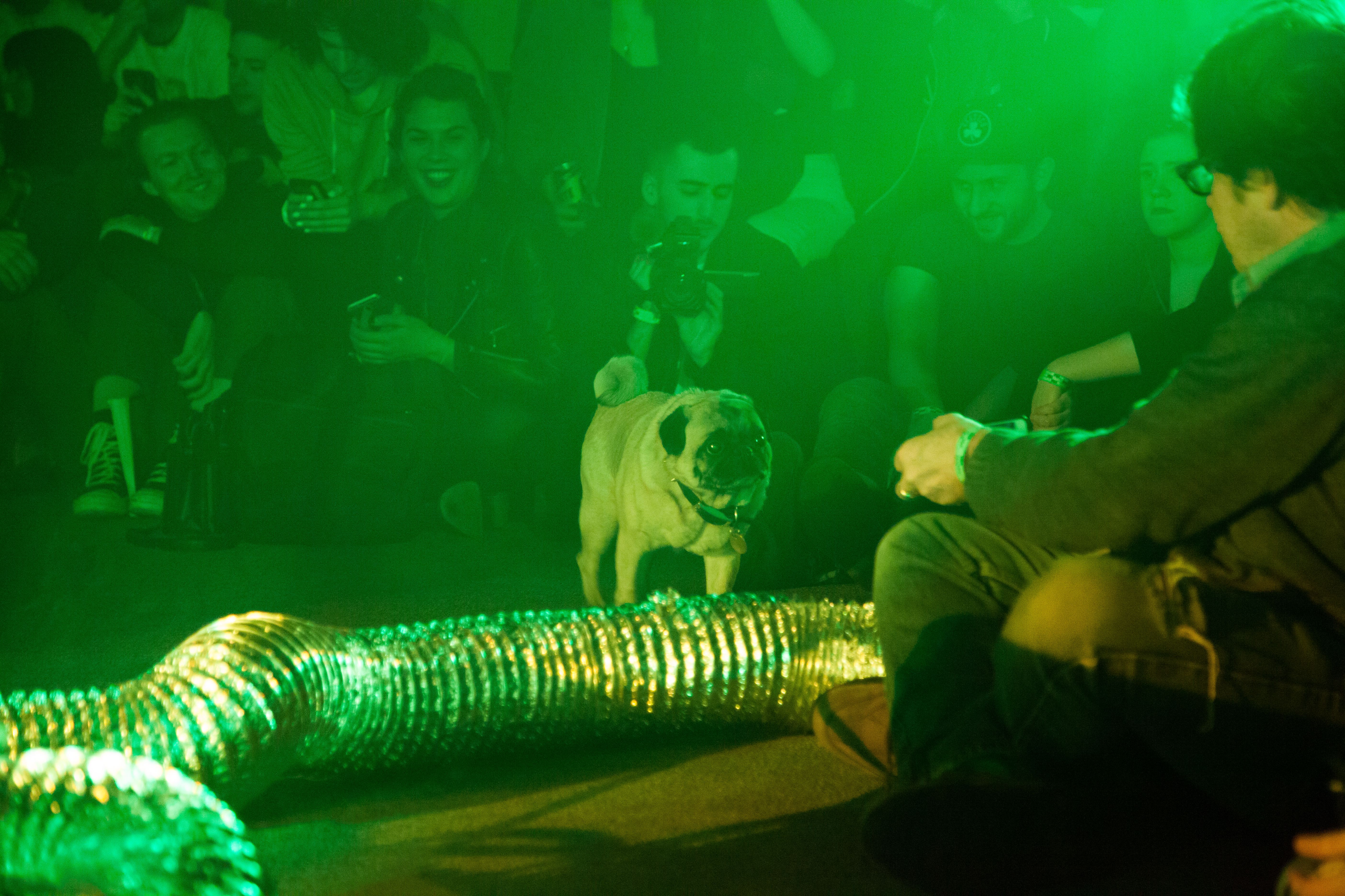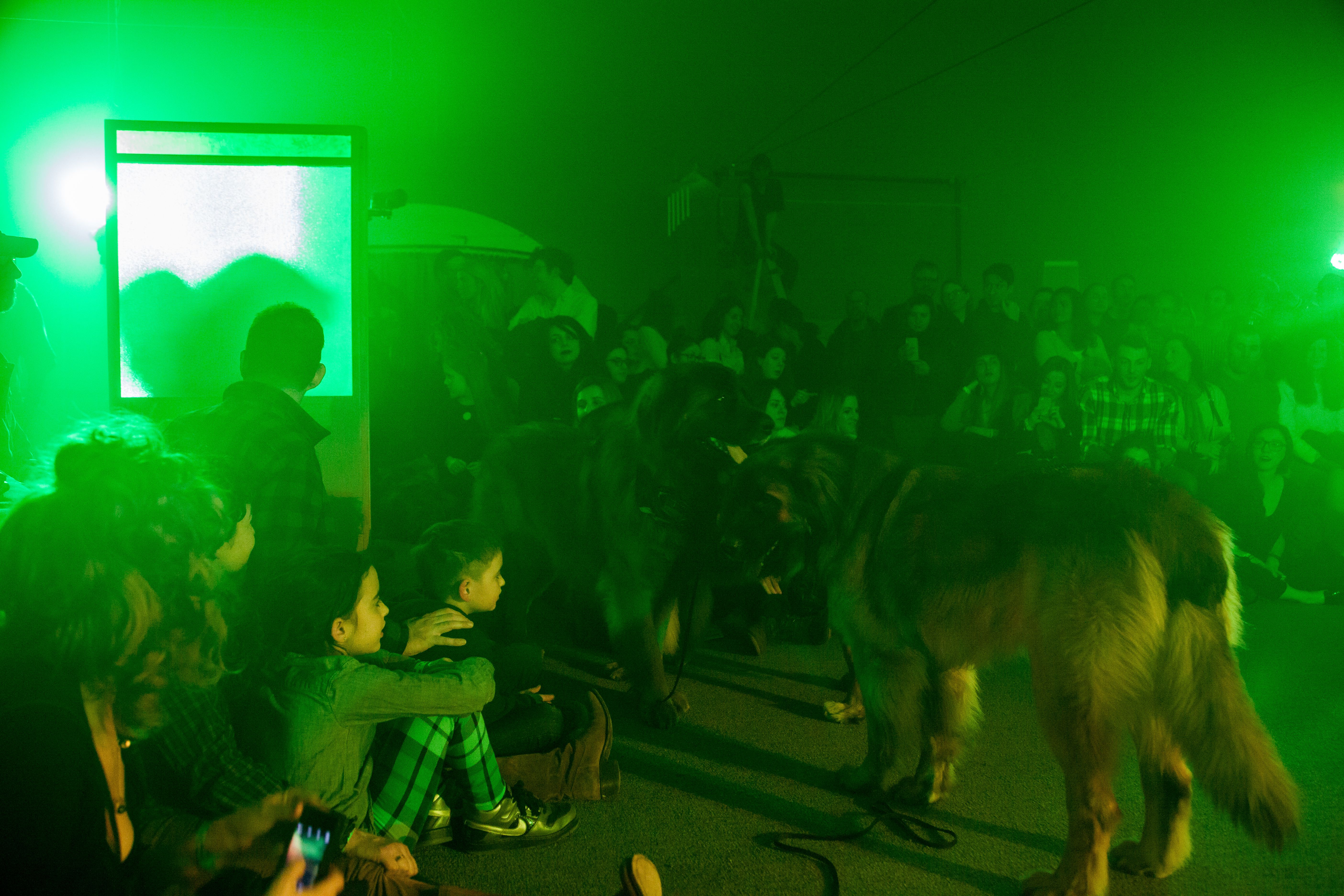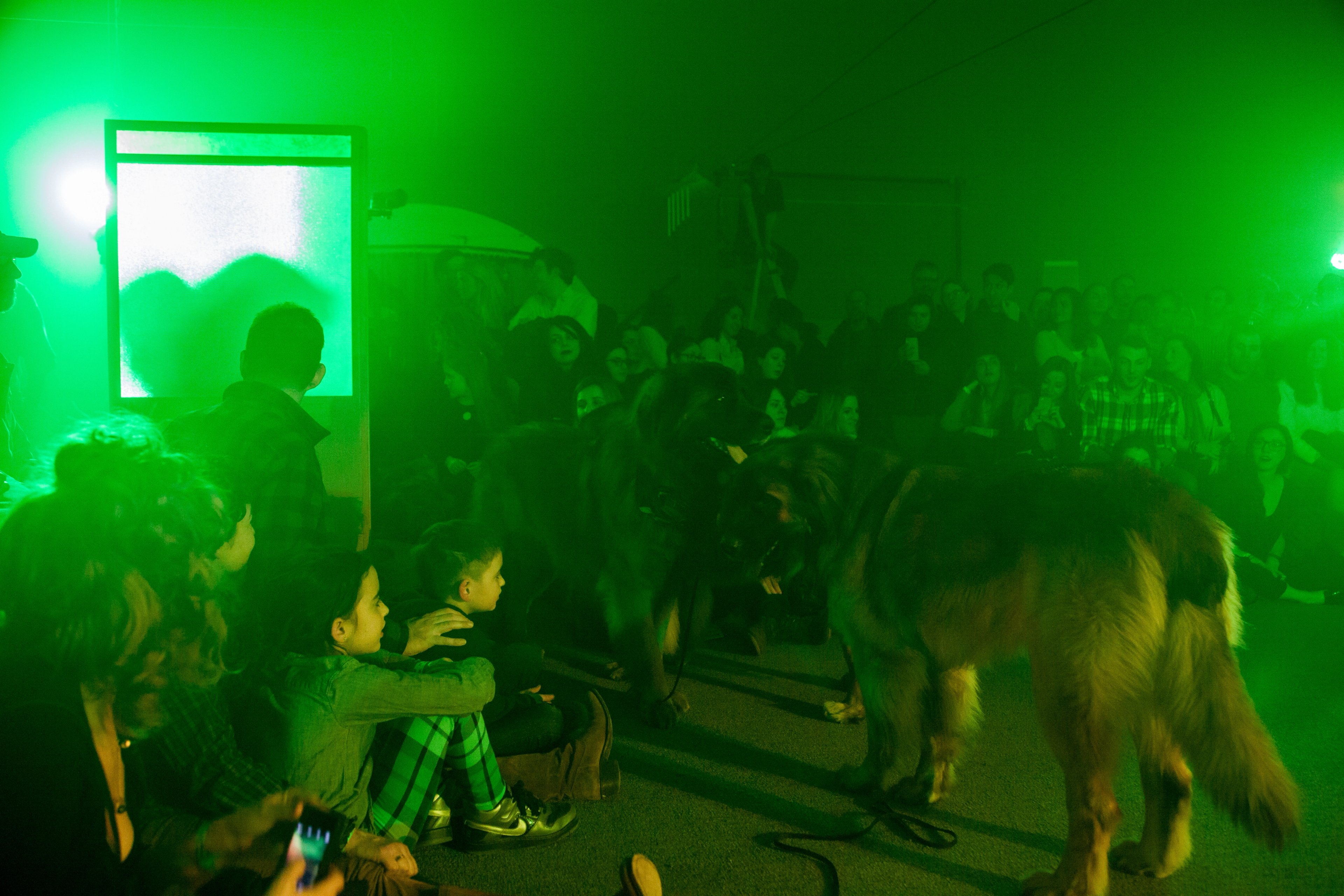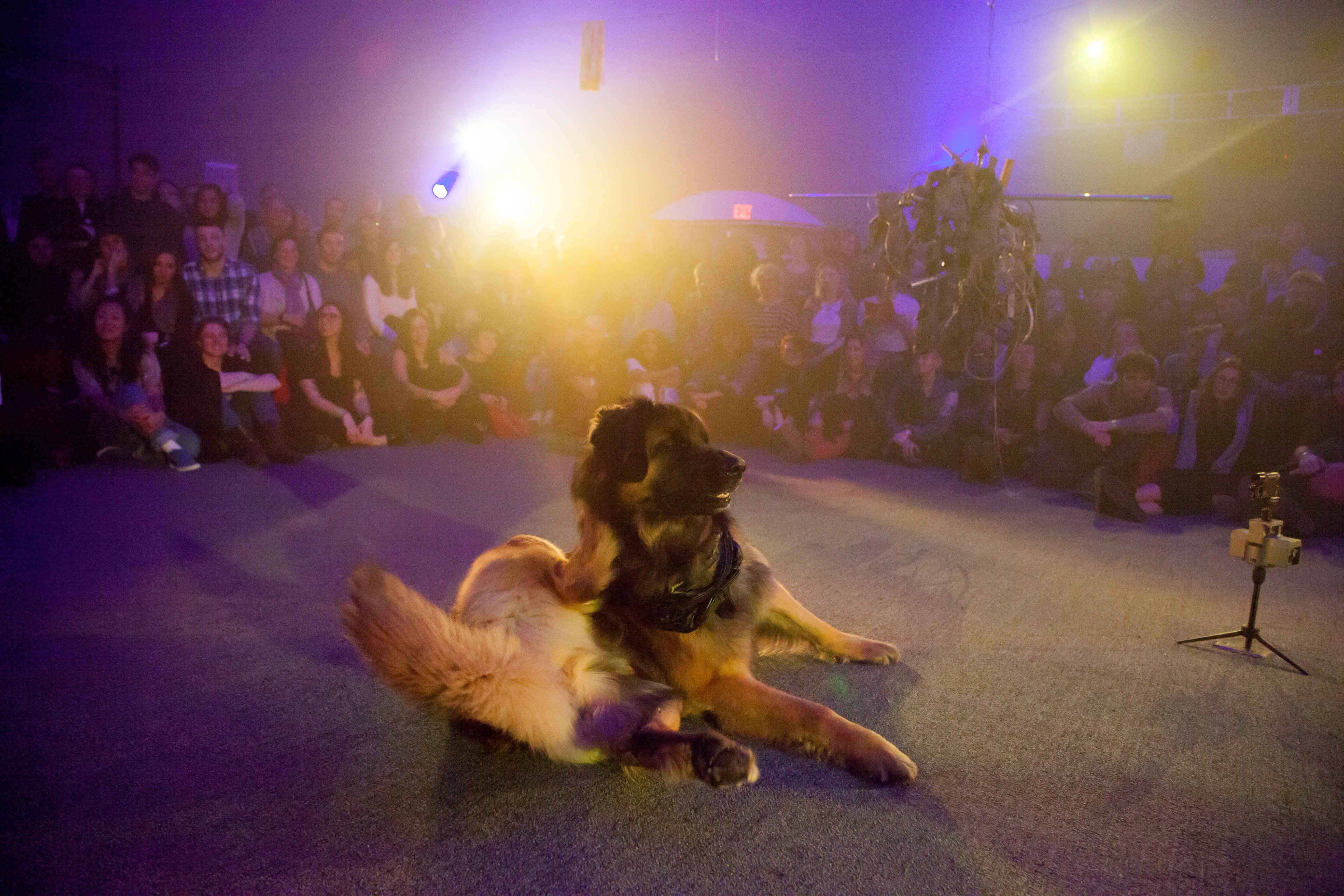 This performance combines elements from the disaster film Twister, 1996, with Charles Dickens’ Oliver Twist, interspersed with songs from the musical, Oliver!. Each dog carries a speaker that projects the internal monologue of its character, prerecorded by human actors, including Vaginal Davis. The play takes place against an apocalyptic backdrop, made in collaboration with Matthew Schrader.