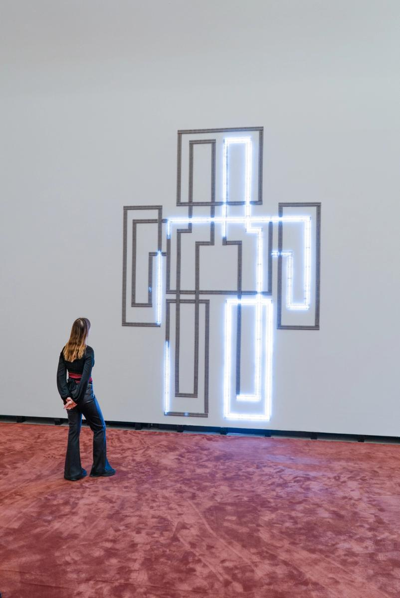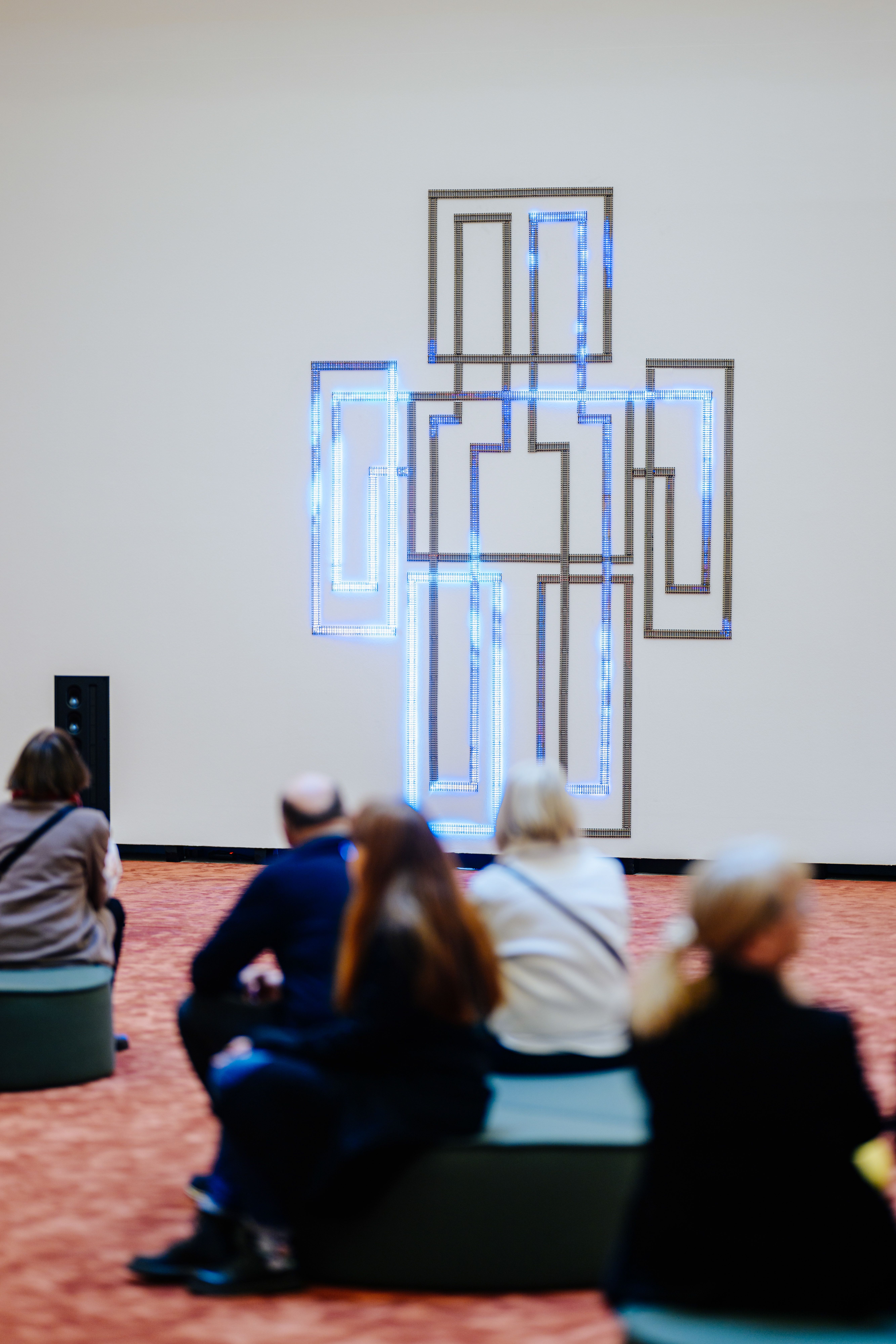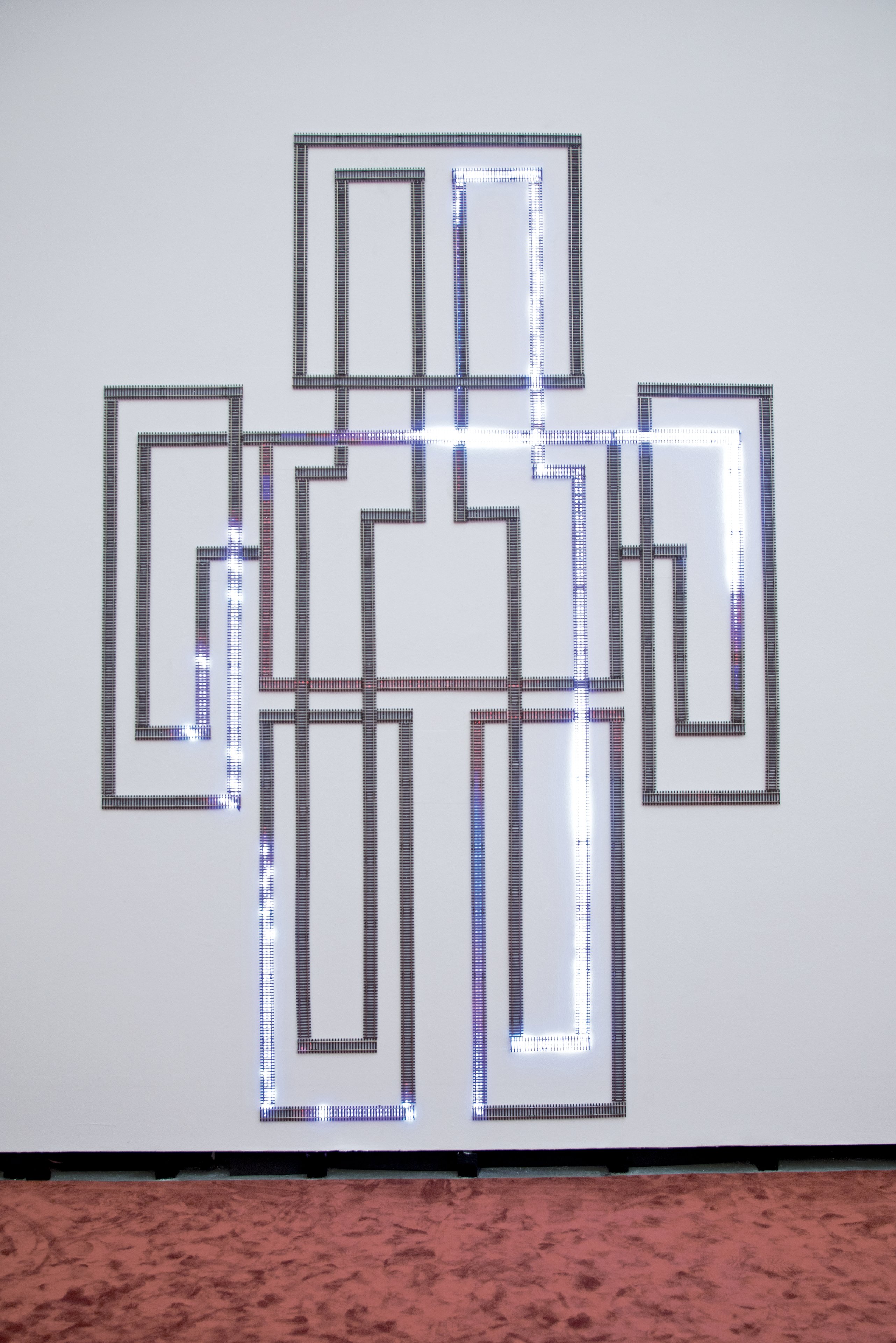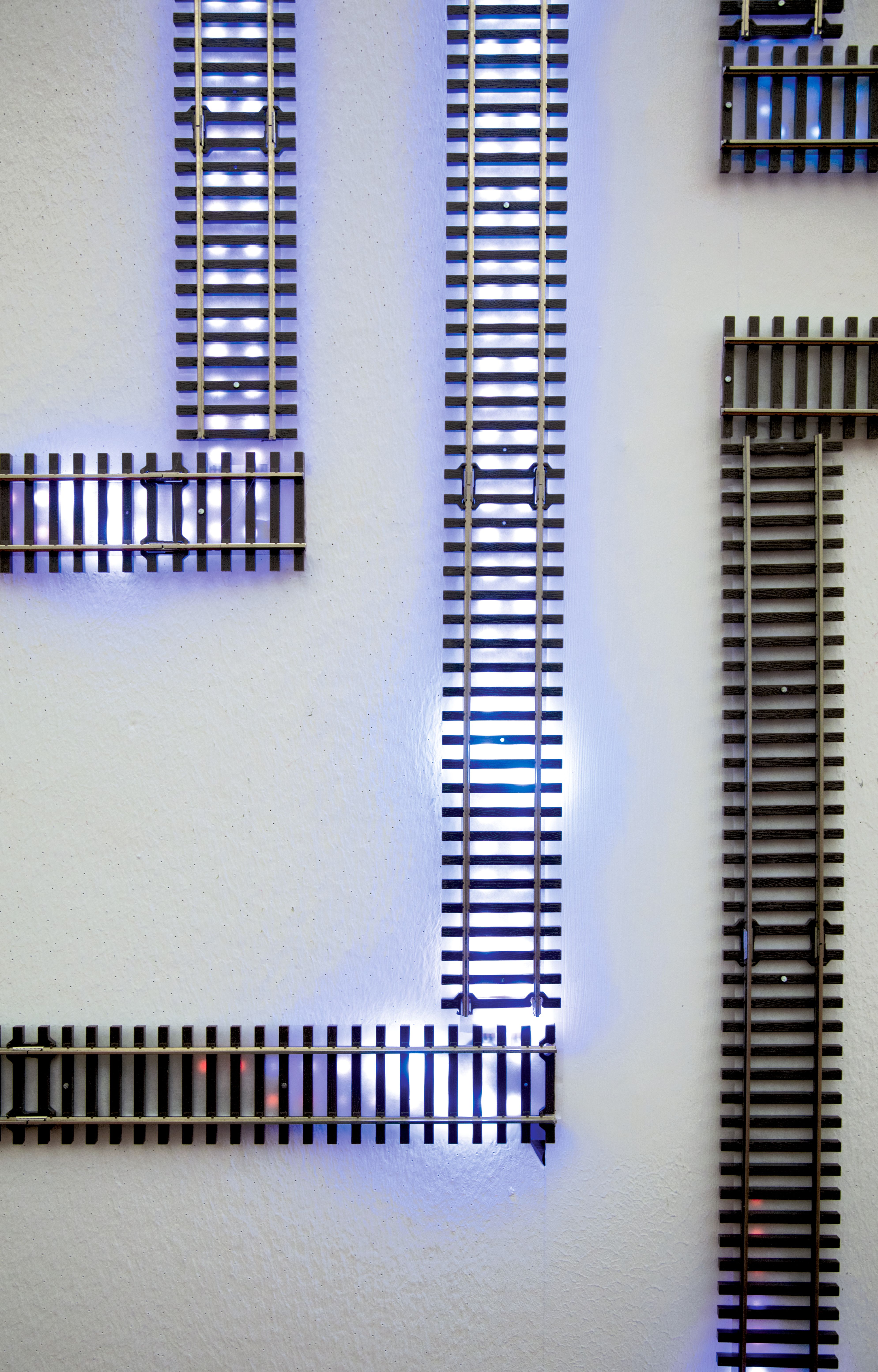 Door of Breath II is an anthropomorphic arrangement of model railway tracks extending over a sound-responsive LED system. Illustrating the intricacies of the central nervous system, the transmission of innumerable signals between every part of the body is rendered visible.
