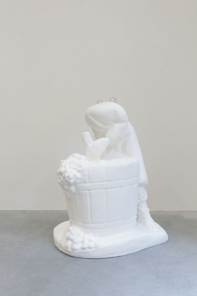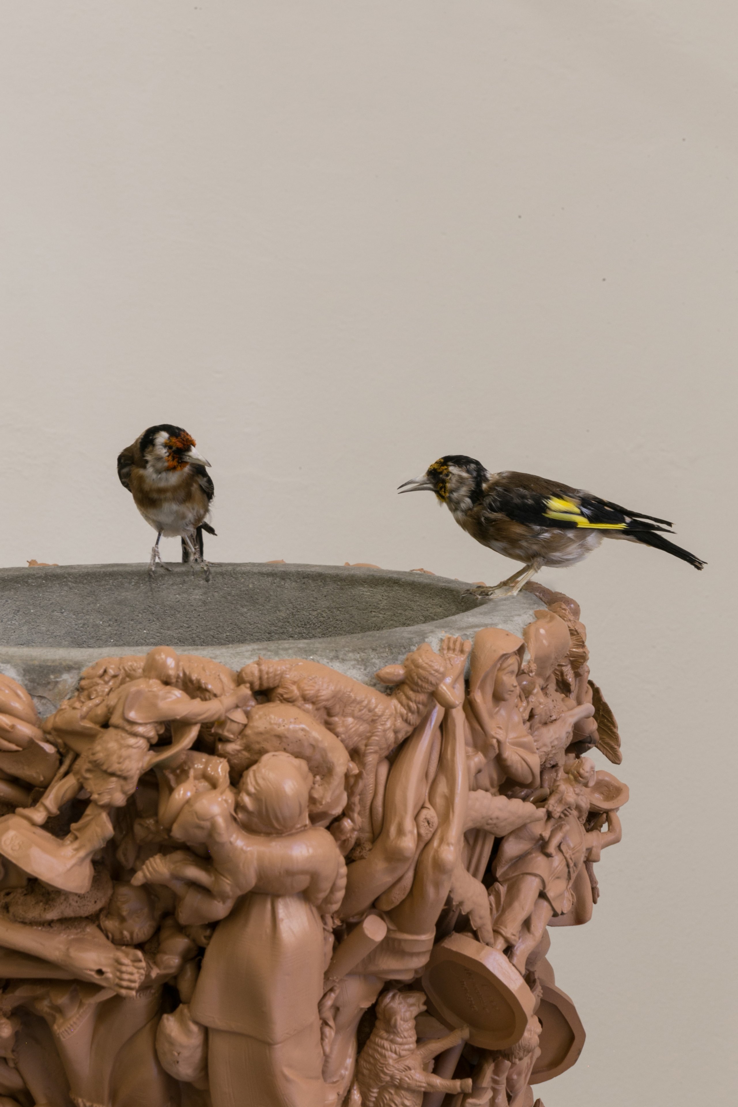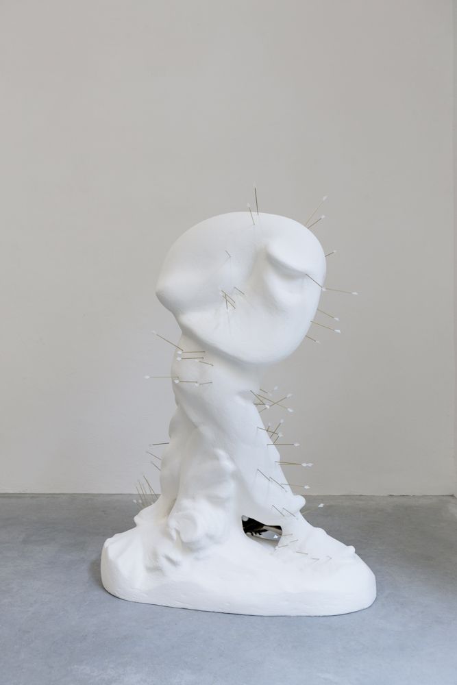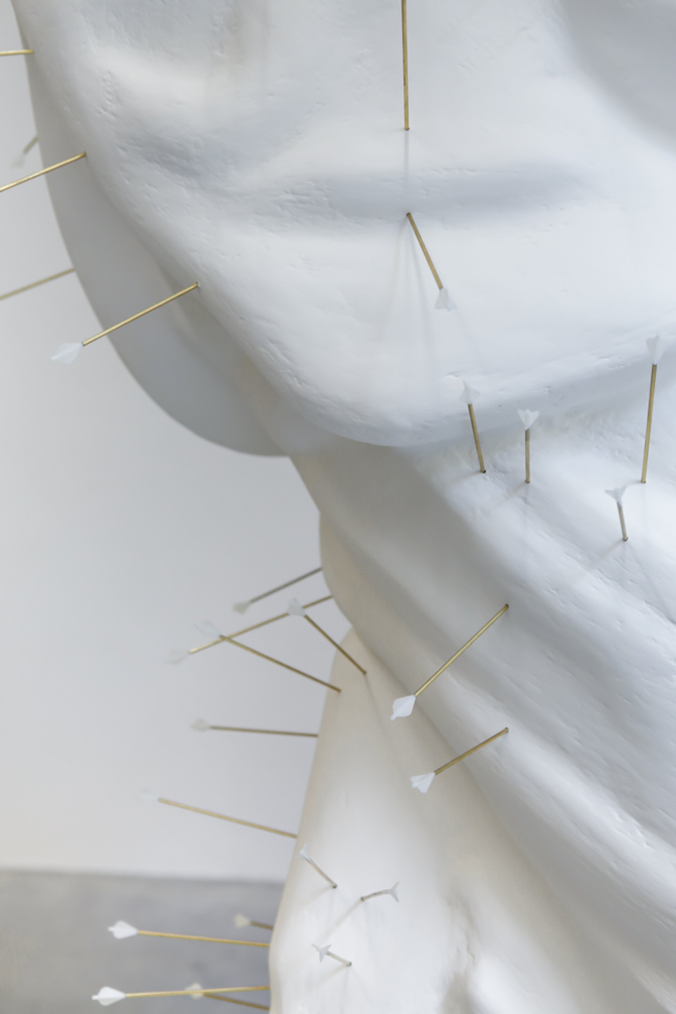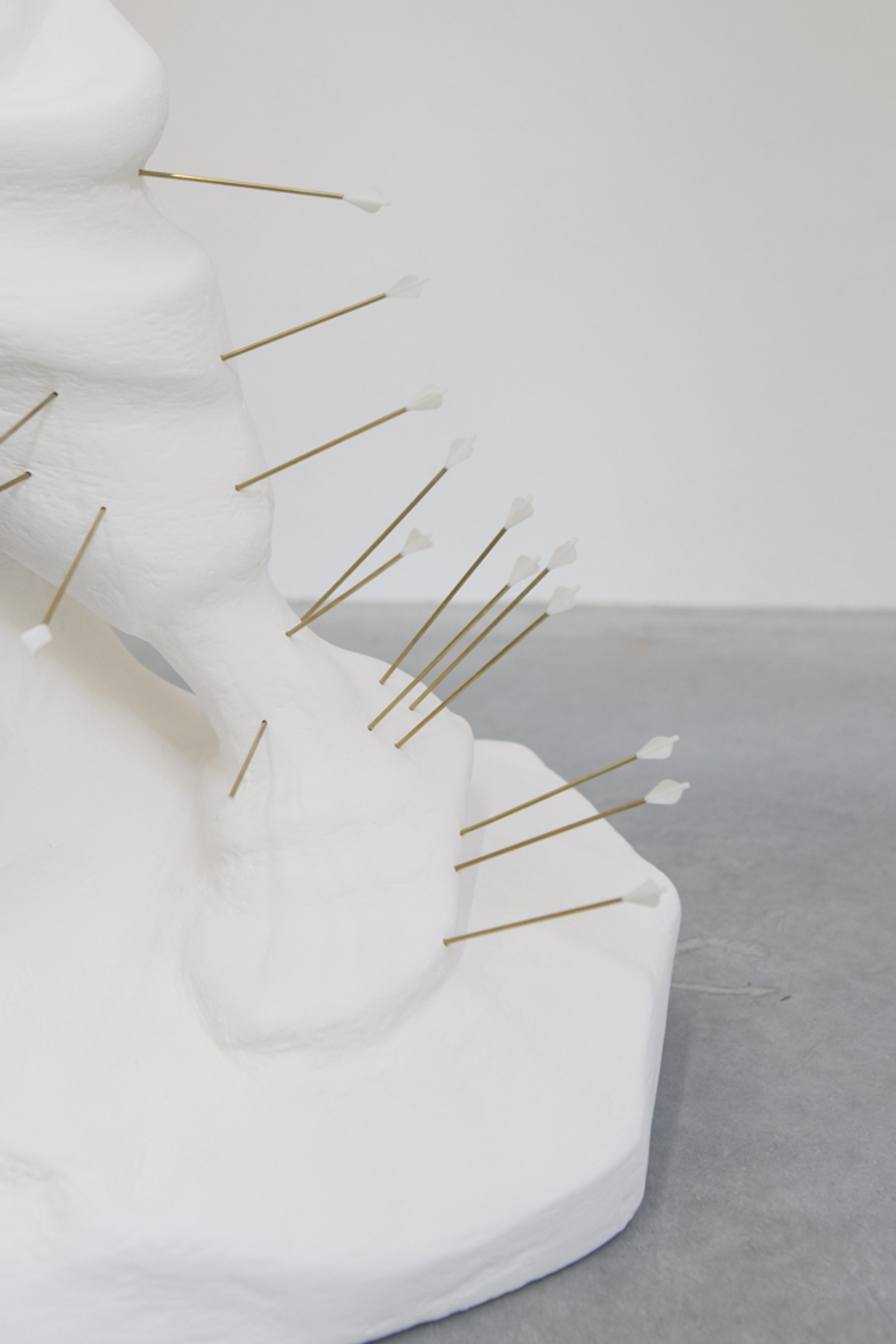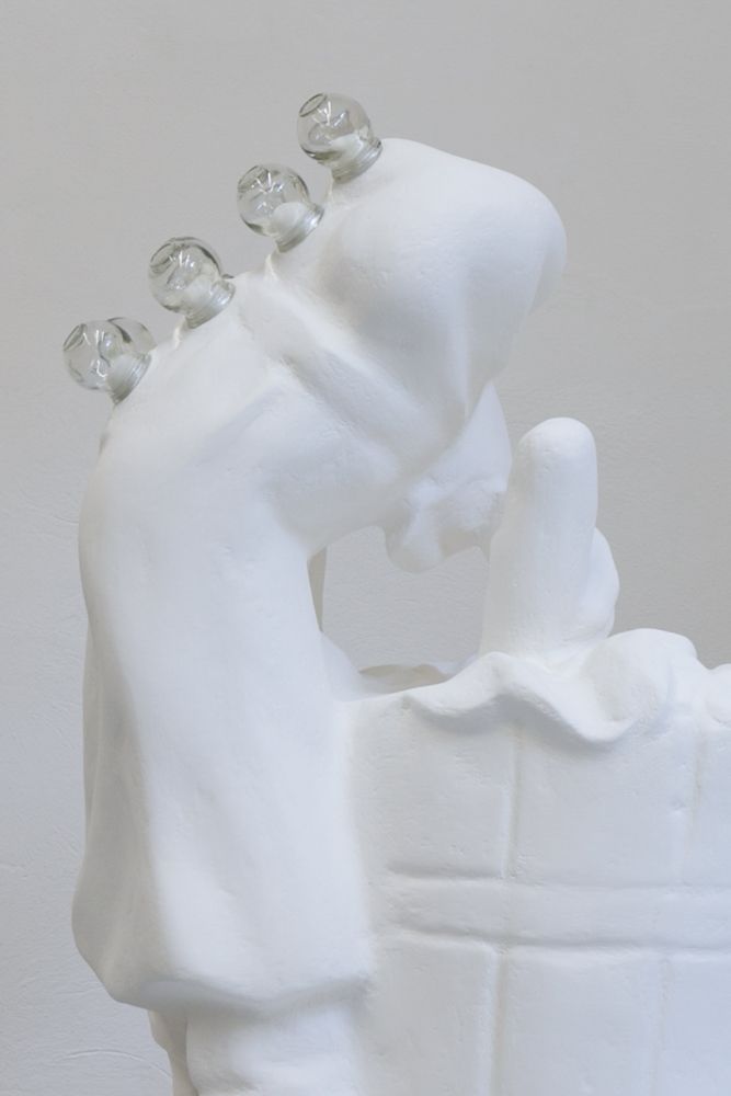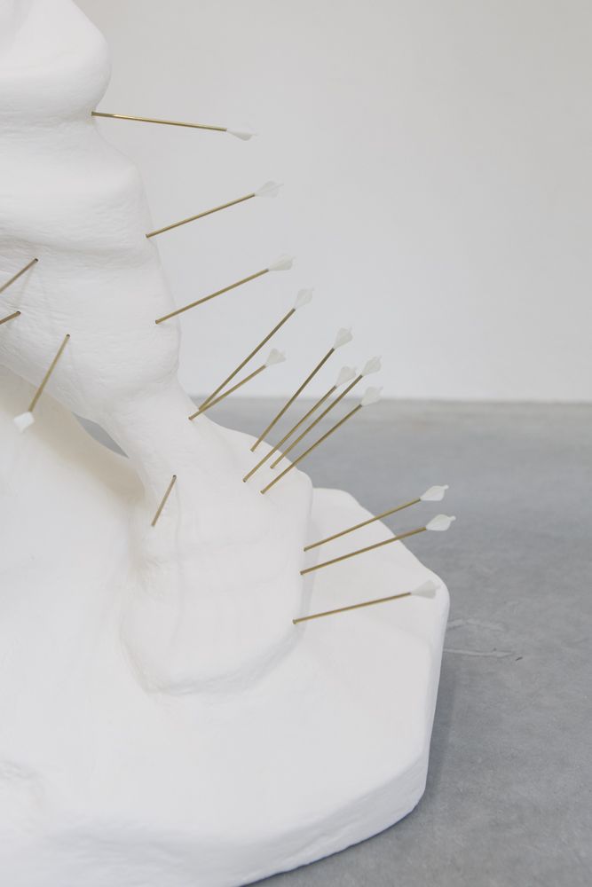 Resulting from accidents in the production process, three scaled-up translations of industrially produced Catholic figurines which were purchased from a factory in Florence, IT are featured in this exhibition. The sculptures are treated for industrialized injuries through the alternative healing practice of cupping and acupuncture, respectively.