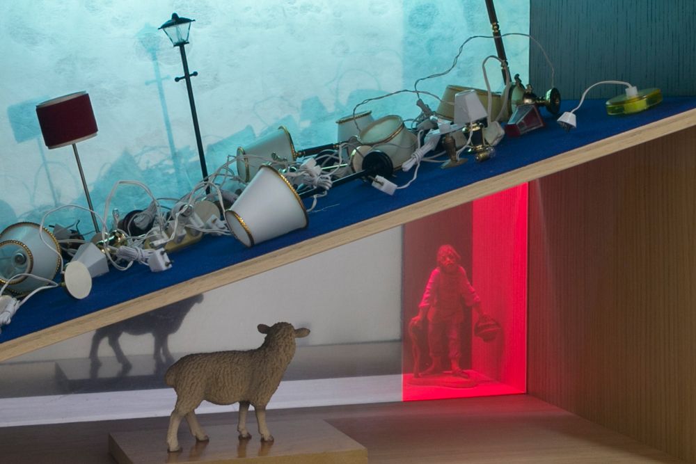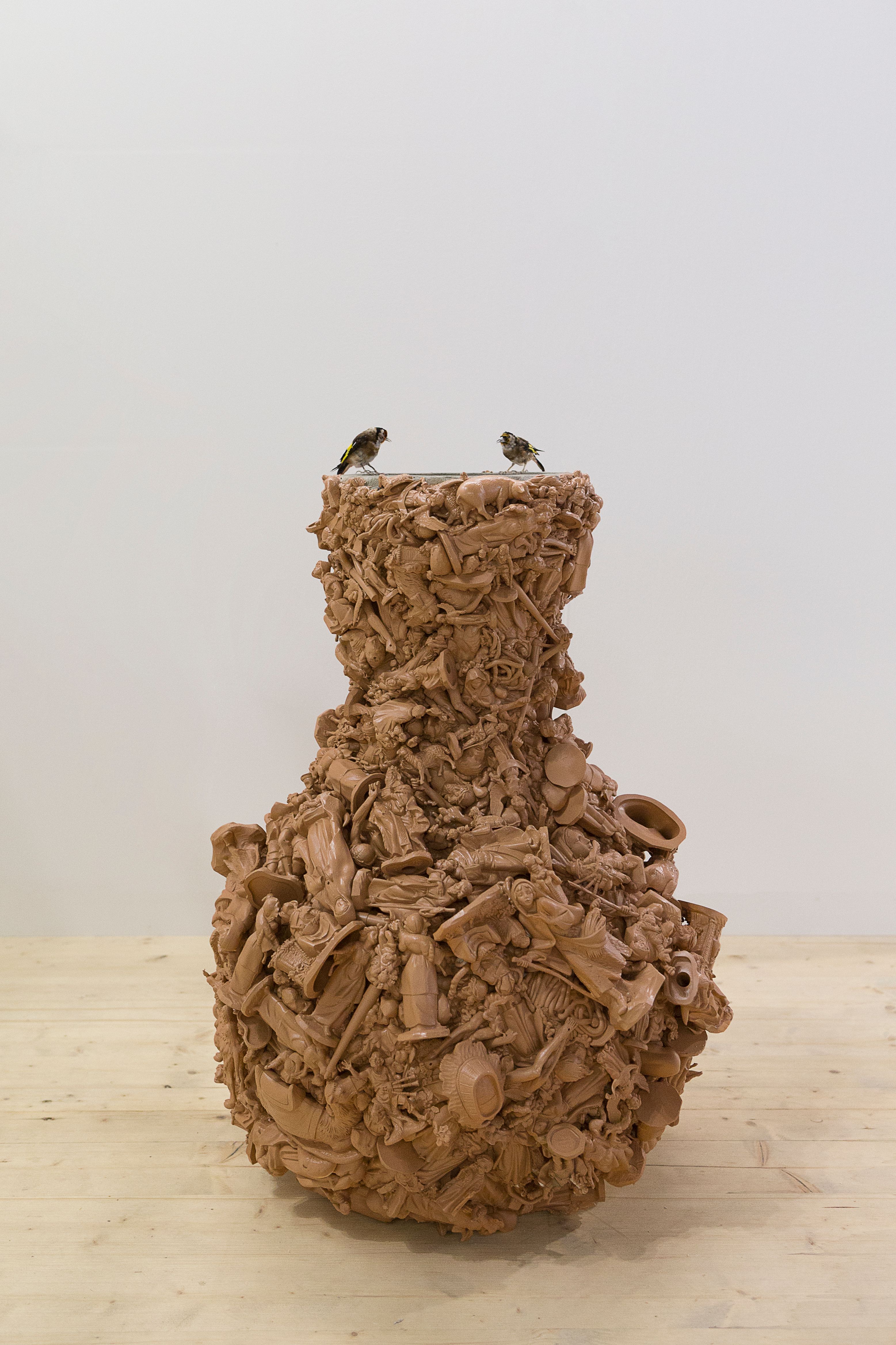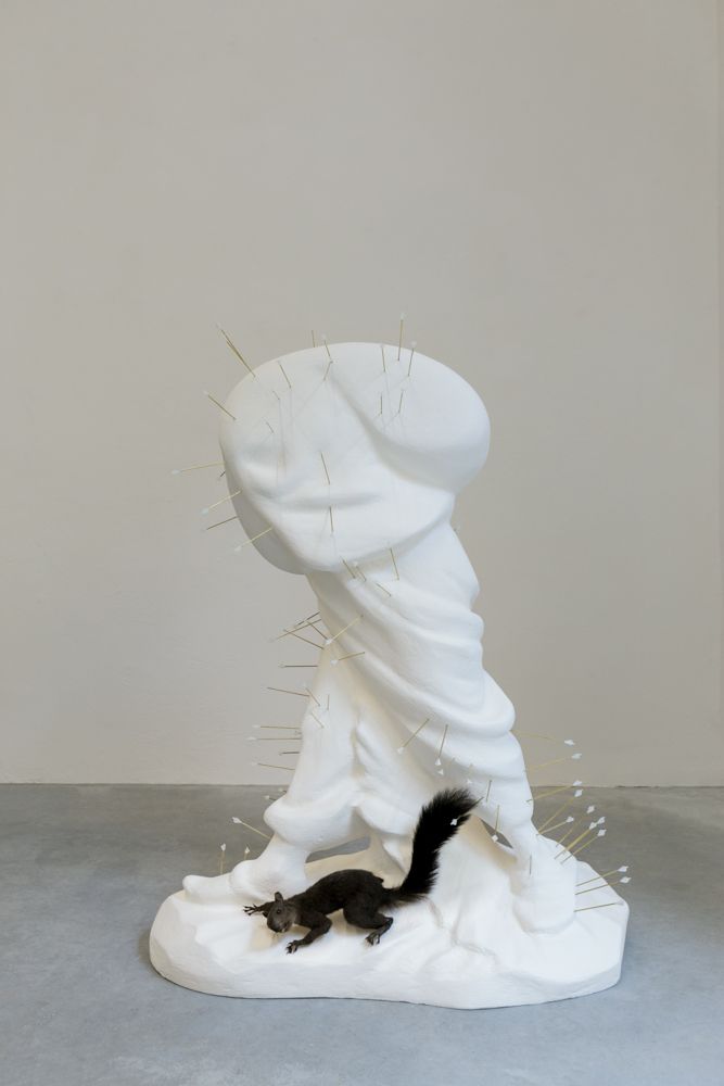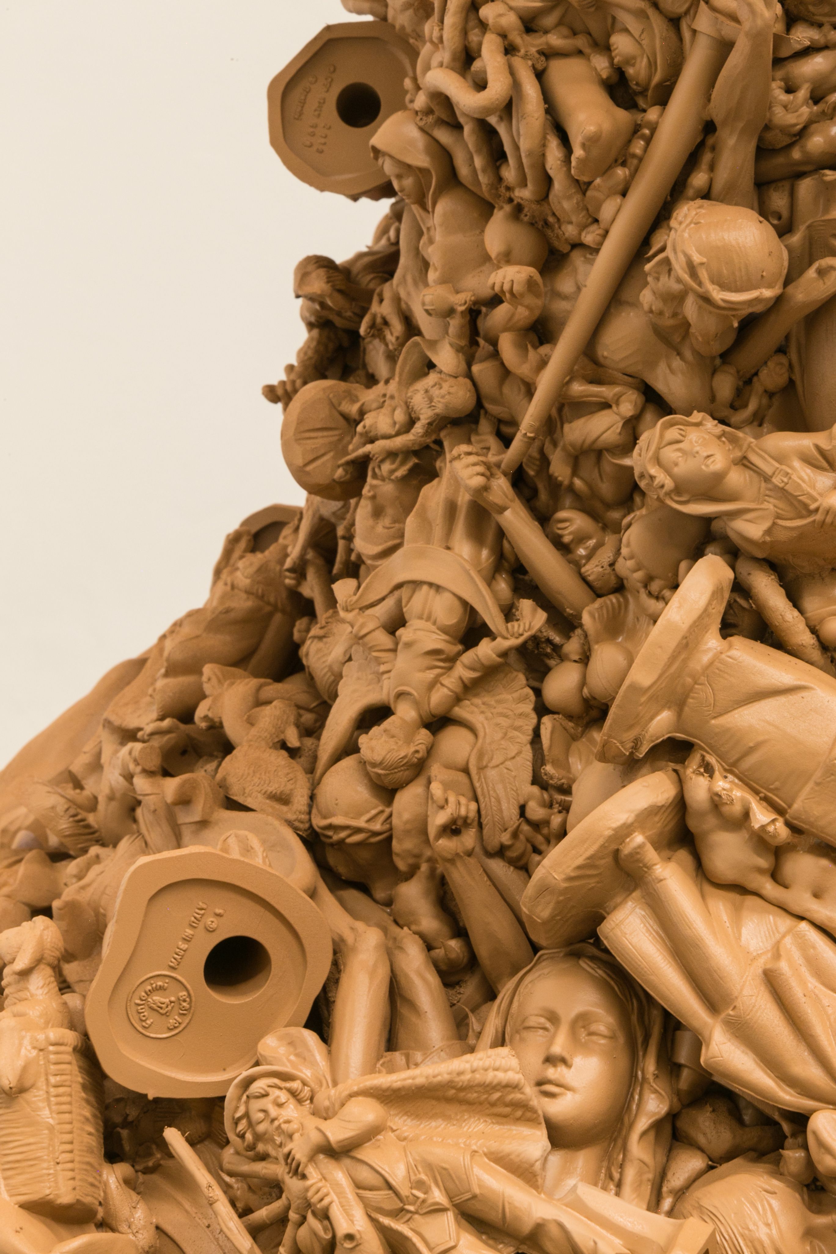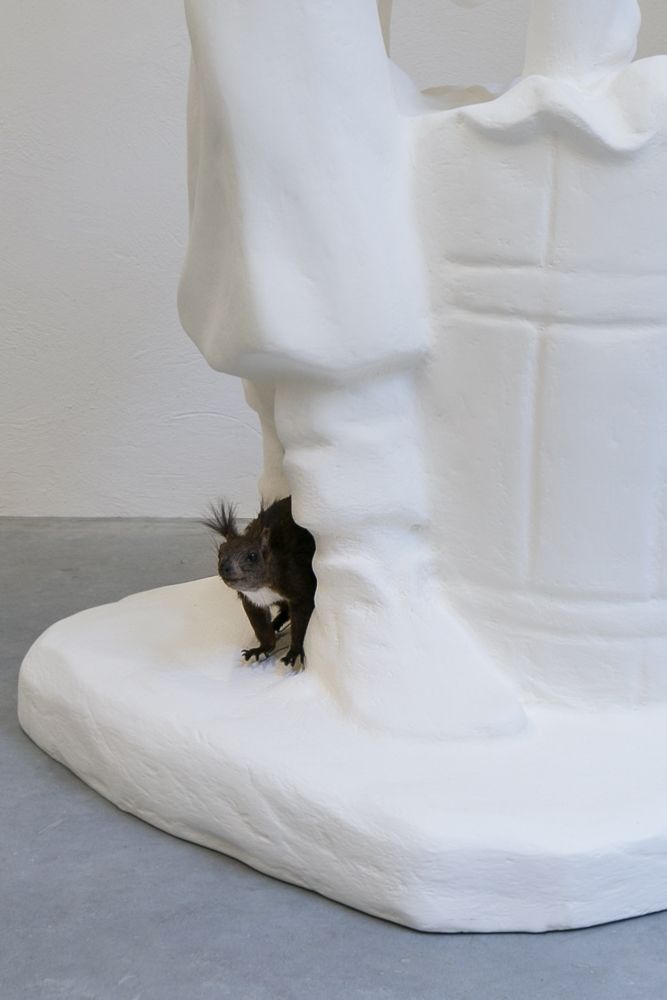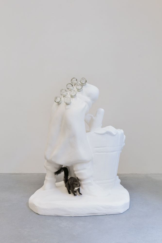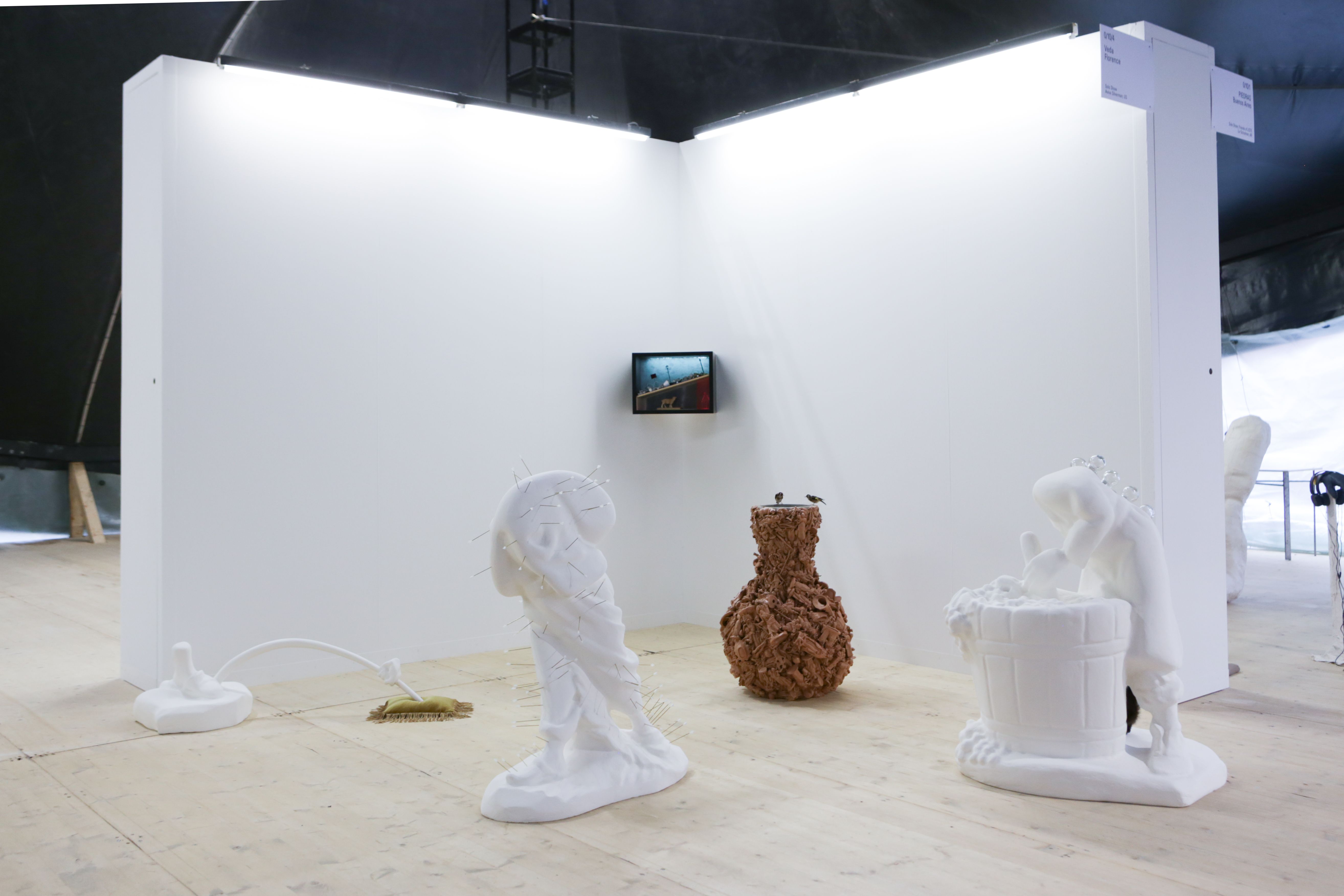 Resulting from accidents in the production process, three scaled-up translations of industrially produced Catholic figurines which were purchased from a factory in Florence, IT are featured in this exhibition. The sculptures are treated for industrialized injuries through the alternative healing practice of cupping and acupuncture, respectively.